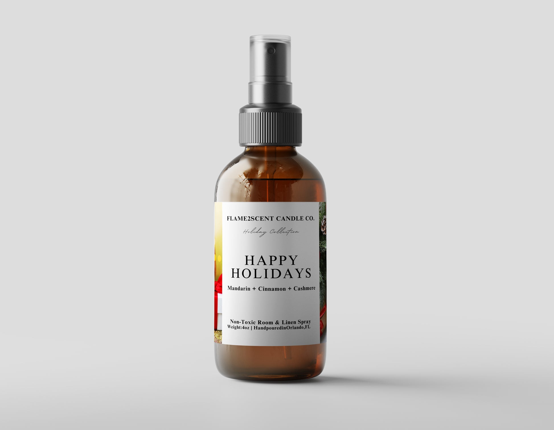 Instantly refresh your space with the Happy Holidays Room and Linen Spray, a cozy, clean, and uplifting fragrance perfect for the season. It opens with mandarin, pomegranate, and black pepper, followed by heart notes of sage, juniper, and apple that bring a hint of natural greenery indoors. The scent finishes with warm vanilla, cinnamon, and amber, rounded out by the soft embrace of cashmere, lavender, and white musk.
